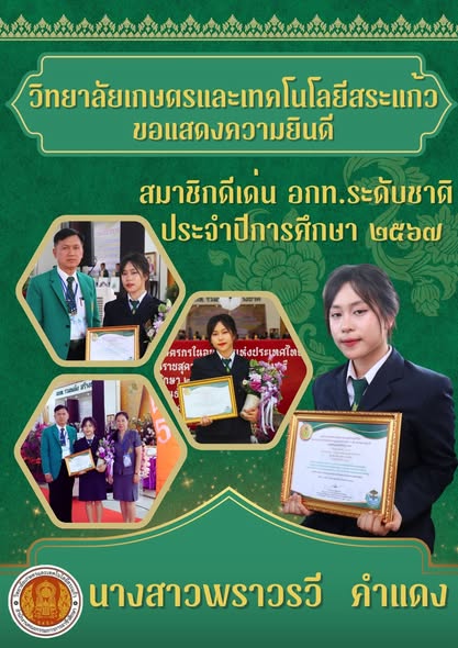 นางสาวพราวรวี คำแดง นักศึกษาระดับชั้น ปวส.๒/๗ สาขาเทคโนโลยีสารสนเทศ แผนกวิชาบริหารธุรกิจ สมาชิก อกท.ดีเด่น ระดับชาติ ครั้งที่ ๔๕ ประจำปีการศึกษา ๒๕๖๗