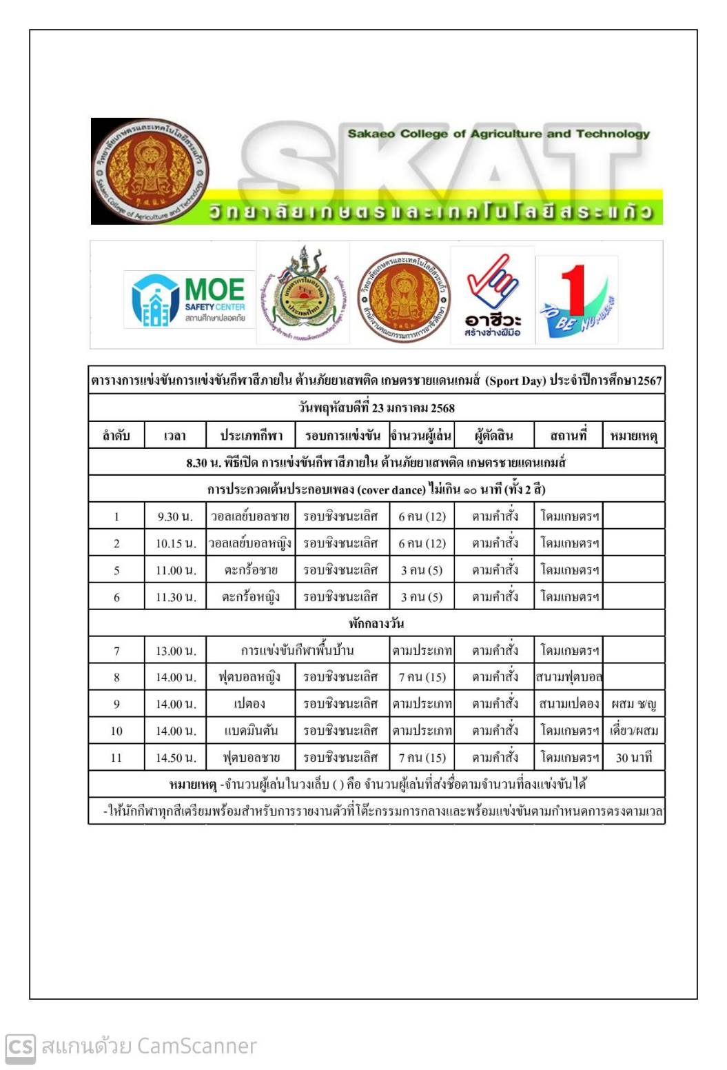 กีฬาภายในเพื่อเยาวชนห่างไกลยาเสพติด วันที่ 23 - 24 มกราคม 2568 ณ โดมเกษตรเกษตรชายแดน/สนามกีฬา วิทยาลัยเกษตรและเทคโนโลยีสระแก้ว