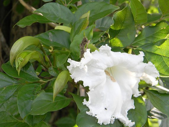 ลักษณะเด่นของพืช :: ไม้ต้นขนาดเล็กถึงขนาดกลาง สูงได้ถึง 10-20 เมตร ผลัดใบ เปลือกลำต้นสีน้ำตาลอ่อนอมเทา อาจมีจุดดำประ ผิวเรียบ หรือล่อนเป็นเกล็ดขนาดเล็ก ลำต้นเปลาตรง มักแตกกิ่งต่ำ ใบ เป็นใบประกอบแบบขนนกชั้นเดียว ปลายคี่ ออกตรงข้าม 3-5 คู่ รูปไข่แกมขอบขนาน ปลายแหลม โคนใบเบี้ยว กว้าง 2.5-7 เซนติเมตร ยาว 6-16 เซนติเมตร ขอบใบหยักแบบซี่ฟันตื้นๆ ผิวใบด้านล่างมีขนสั้นประปรายบนก้านใบ ก้านใบย่อยยาว 7-10 มิลลิเมตร ดอกเป็นดอกช่อแบบช่อกระจะสั้น ดอกใหญ่ รูปแตร สีขาว ออกตามปลายกิ่ง ยาว 2-3 ซม. ก้านดอกยาว 1.8-4 เซนติเมตร แต่ละช่อมี 2-10 ดอก บานทีละดอก กลิ่นหอม บานตอนกลางคืน รุ่งเช้าร่วง กลีบเลี้ยงหนาและเหนียว ปลายเรียวเล็กโค้งยาว 3-4 เซนติเมตร
