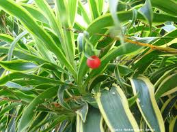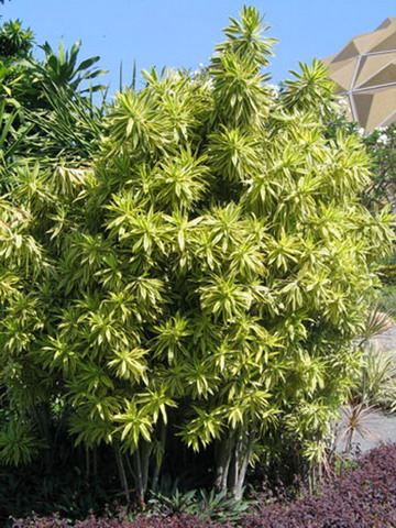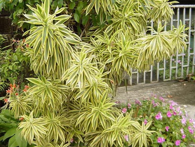 ลักษณะเด่นของพืช :: ลำต้นสีเทาแตกกิ่งก้านสาขา และ ใบเดี่ยวรูปหอกปลายแหลม ที่เรียงเวียนถี่บริเวณปลายกิ่ง โดยมี แถบสีเหลืองทองที่ขอบใบตัดกับสีเขียวตรงกลางใบ ทำให้มีสีสันสวยงาม มักนิยมปลูกเป็นไม้ประดับทั้งในสวนกลางแจ้งและในอาคาร เพราะเลี้ยงง่าย ทนแดดได้ดี และต้องการน้ำปานกลาง.
