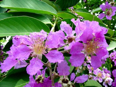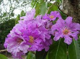 ดอก : ดอกช่อแบบช่อกระจะที่ปลายกิ่ง ดอกสีม่วงอมชมพูและจะจางซีดลงเป็นสีขาวอมชมพูช่อดอกยาว 10-30 ซม. ดอกตูมเป็นรูปลูกข่าง ส่วนบนมีรอยบุ๋มตามยาว ดอกบานกว้าง 7-12 ซม. กลีบเลียงรูป ถ้วยปลายแยกออกเป็น 6 แฉก มีสันนูนตามยาว กลีบดอกค่อนข้างกลม 6 กลีบ โคนกลีบสอบเรียว เป็นก้าน กลีบดอกบางและย่น เกสรเพศผู้จ้านวนมากเป็นกระจุกสีเหลืองอยู่กลางดอก รังไข่เกลียง