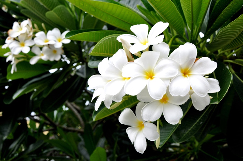 ลักษณะเด่นของพืช :: ดอกสวยกลิ่นหอม มี 5 กลีบ (มักมีสีขาว เหลือง ชมพู แดง) ออกเป็นช่อที่ปลายกิ่ง มี น้ำยางสีขาว ที่มีพิษเล็กน้อย และ กิ่งก้านเปราะ แต่เติบโตได้ดีในเขตร้อน ทำให้เป็นไม้ประดับยอดนิยม.